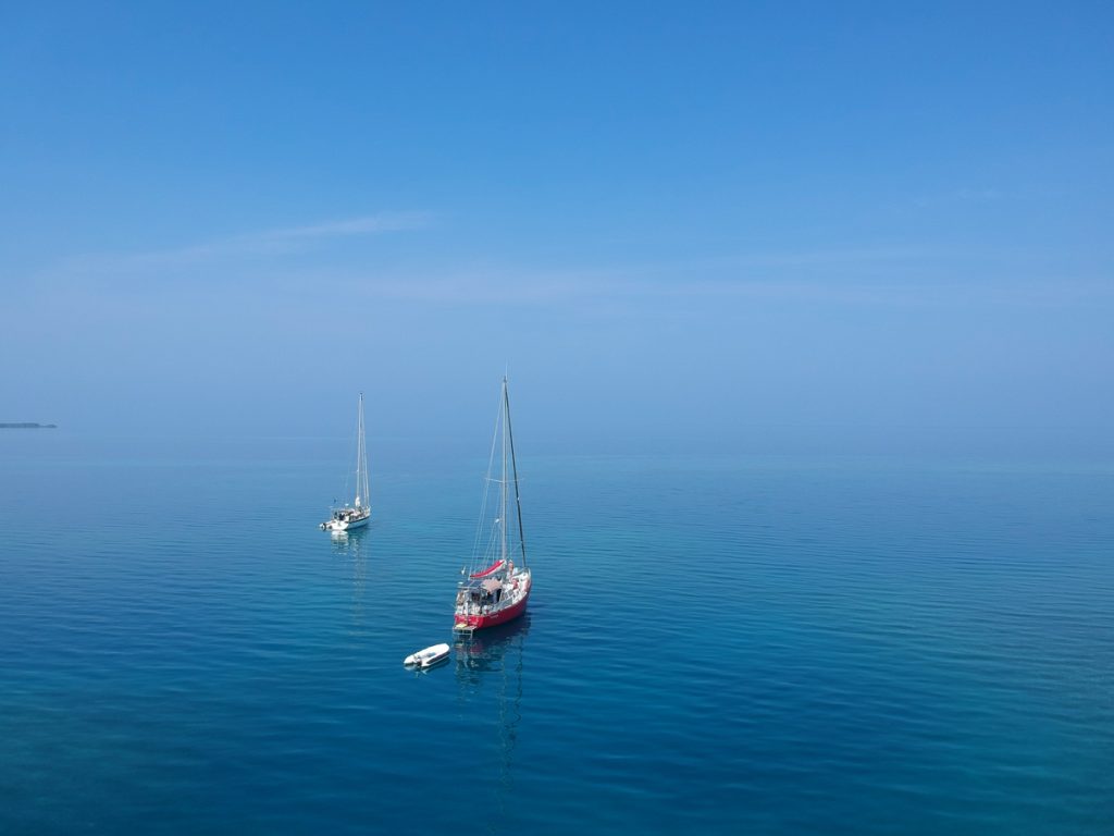 „Poor holding“ heißt es in der Seekarte, denn der Grund ist von dichtem Seegrass bewachsen. Auf zweieinhalb Metern Wassertiefe lassen wir den Anker und ordentlich Ankerkette hinunter, bevor wir jedoch Rückwärtsgas geben, um den Anker in den Grund einzugraben, springt einer mit Taucherbrille ins Wasser und stößt den Anker mit seiner Spitze kräftig durch Seegras und Wurzeln in den darunterliegenden Sand. Rückwärtsgas – Anker hält.