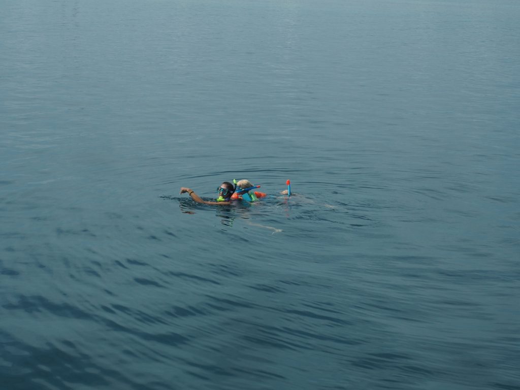 Am nächsten Morgen nach dem Frühstück sind sämtliche Kinder mit Maske und Schnorchel im Wasser, selbst Naia wagt die ersten Schnorchelversuche, und suchen das Geschirr. „Hier sind sie!“ Ein paar Meter hinter dem Boot sieht man zwei Teller auf dem Grund. Also Luft anhalten, den leichten Kater kurz ignorieren und ab auf Tiefe. In jedem der beiden Teller liegt noch ein zweiter, so dass unser Geschirr wieder komplett ist. Nur die Gabeln bleiben wohl etwas dezimiert.