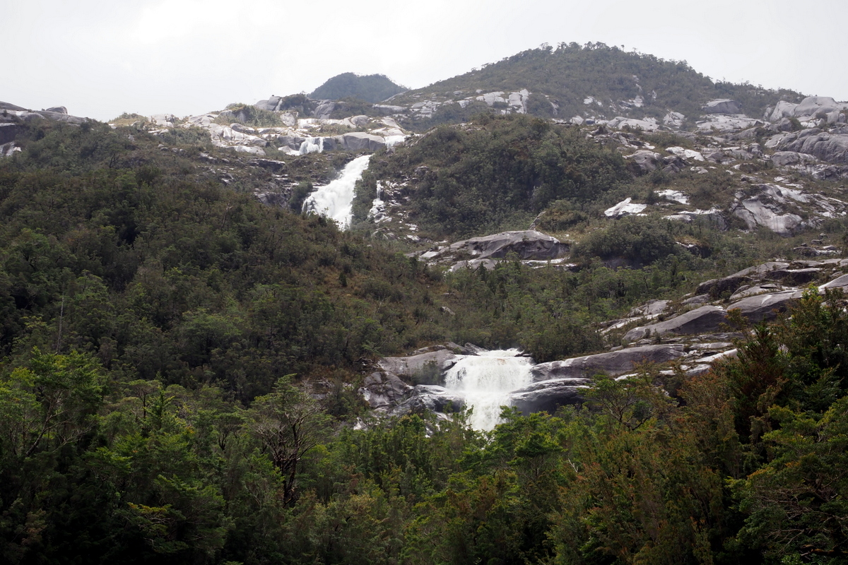 Zwei Tage später stoppt der Regen, zumindest für einen Tag, und wir setzen unsere Reise in Richtung der kleinen Ortschaft Caleta Tortel fort. Caleta Tortel markiert das Ende eines langen Gletscherfjords und je näher wir der Ortschaft kommen, desto mehr nimmt das Wasser die typische, eisblaue Farbe von Gletscherwasser an. Rings um uns ragen blankgeschliffene, steile Felsen in die Höhe, die Vegetation hier ist deutlich karger als nördlich des Golfs. Die Bäume wachsen, wenn überhaupt, meist nur wenige Meter vom Ufer und an windgeschützten Stellen. Überall entspringen Quellen und egal wo wir hinsehen stürzen hohe Wasserfälle in die Tiefe, jeder einzelne spektakulär und beeindruckend. Die wilde und ungezähmte Natur macht das schlechte Wetter wett. Mit Ölzeug, Handschuhen, Mütze und gefütterten Gummistiefeln stehen wir im Cockpit und genießen das Panorama.