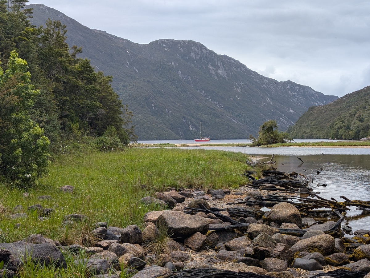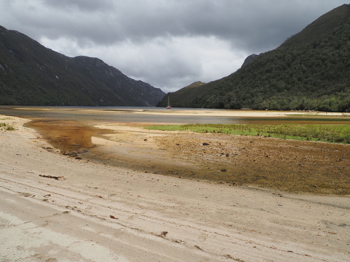 Nach 20 Meilen liegt an unserer Backbordseite eine große Bucht, in der wiederum eine sehr kleine Einbuchtung einen sicheren Ankerplatz verspricht. Noch ist es ruhig, aber für die kommenden Tage sind Böen mit bis zu 50 Knoten, also knapp 100 km/h vorhergesagt. Wir machen das Beiboot klar und bereiten ein paar Landleinen vor, bevor wir unsere ARACANGA so in die kleine Bucht manövrieren, dass die Böen von vorne kommen und unser Cockpit somit trocken und geschützt bleibt. Sechs Leinen – zwei Backbord voraus, zwei Backbord achtern und je eine Steuerbord vorne und achtern sichern das Boot, so dass wir sicher liegen. Den Rest des einzigen trockenen Tages nutzen wir, nach dem vielen Regen der letzten Zeit, endlich wieder an Land zu gehen und die Gegend zu erkunden. Kira fährt im Kajak, welches wir in Puerto Chacabuco als vorgezogenes Weihnachtsgeschenk gefunden haben, und jeder ist froh, einen Tag ohne Regen zu haben.